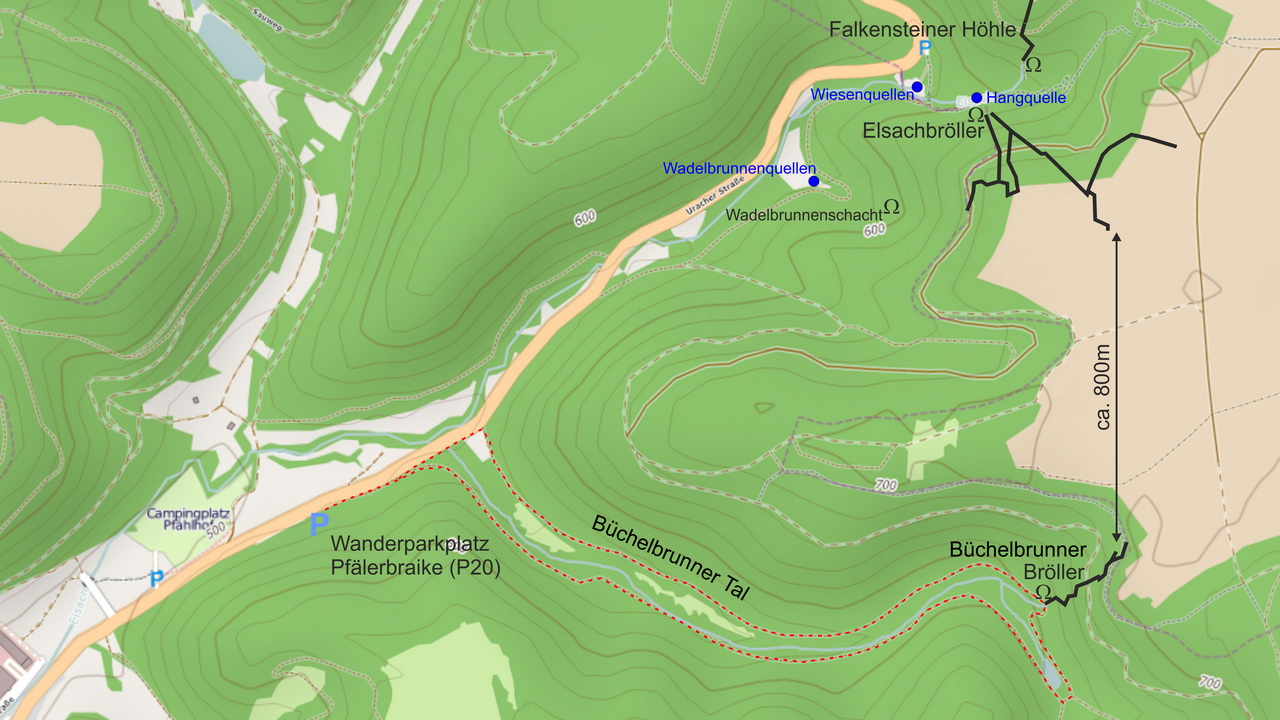 Der Büchelbrunner Bröller gilt als mögliche Fortsetzung der Grabenstettener Großhöhle, die Falkensteiner Höhle und Elsachbröller umfasst. Die Kartenskizze zeigt einen Überblick über den räumlichen Zusammenhang der Höhlenteile und der in Verbindung stehenden Quellen. [Kartenskizze gezeichnet nach Plänen von WITZIG und WINTER S.77ff sowie MEYBERG S.59ff in Arbeitsgemeinschaft Höhle & Karst Grabenstetten (1991) unter Verwendung von OSM1 als Kartengrundlage.]