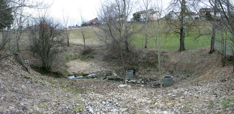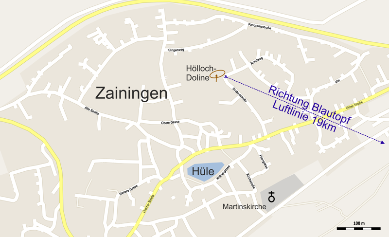 Die Hüle entwässert in nördlicher Richtung in die am Rande des Ortskerns gelegene Hölloch-Doline. Früher wurde diese Doline auch für die Abwässer der ehemaligen Kläranlage Zainingen genutzt. Markierungsversuche erbrachten eine Verbindung zum Blautopf. (vgl. Binder 2003 und Goldscheider 2013)