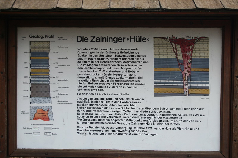 „Vor etwa 20 Millionen Jahren rissen durch Spannungen in der Erdkruste tiefreichende Spalten in den Gesteinen Südwestdeutschlands auf. Im Raum Urach-Kirchheim reichten sie bis zu einem in der Tiefe lagernden Magmaherd hinab. Die im Magma enthaltenen Gase schossen in den Spalten empor und rissen Magmatropfen - die schnell zu Tuff erstarrten - und Nebengesteinsbrocken - Gneis, Keupertonstein, Jurakalk, u. a. - mit. Dieses Lockermaterial fiel in weitem Umkreis um die Ausbruchsstellen nieder. Bei der eruptiven Fördertätigkeit wurden die schmalen Spalten vielerorts zu Vulkanschloten erweitert. So geschah es auch an dieser Stelle. Als die vulkanische Tätigkeit schließlich wieder nachließ, blieb der Tuff in den Förderkanälen stecken und von den Seiten her rutschten Nebengesteinsschollen in den Schlot. Im Krater über dem Schlot sammelte sich dann auf den wenig wasserdurchlässigen Tuffen das Niederschlagswasser. Es entstand ein See- eine »Hüle«. Da in den umgebenden, kluftreichen Kalken das Wasser sogleich in die Tiefe versickert, waren die Kraterseen in der wasserarmen Weißjuralandschaft ein begehrter Mittelpunkt von Ansiedlungen. Im Laufe der Zeit verlandeten die meisten dieser Seen, die Zaininger Hüle ist eine der letzten. Bis zum Bau der Albwasserversorgung im Jahre 1921 war die Hüle als Viehtränke und Brauchwasserreservoir lebenswichtig für das Dorf. Sie war, ist und bleibt ein Charakteristikum für Zainingen.“