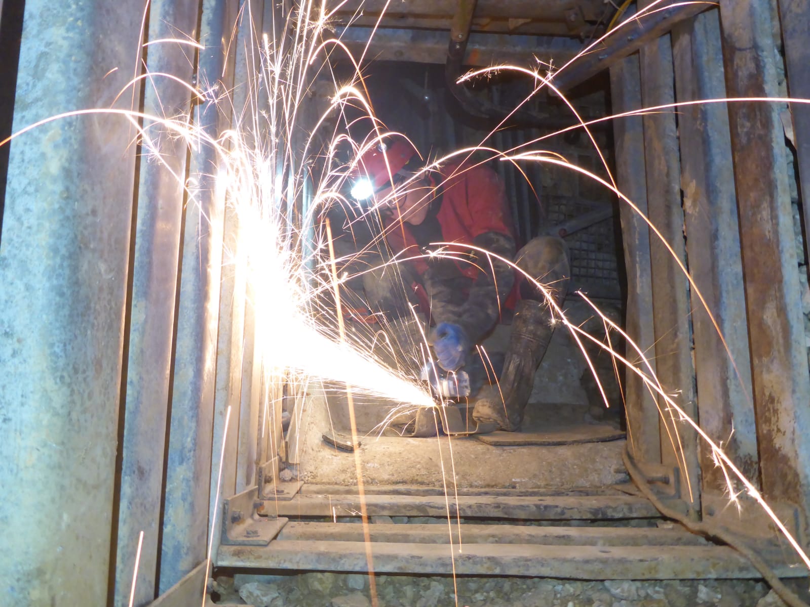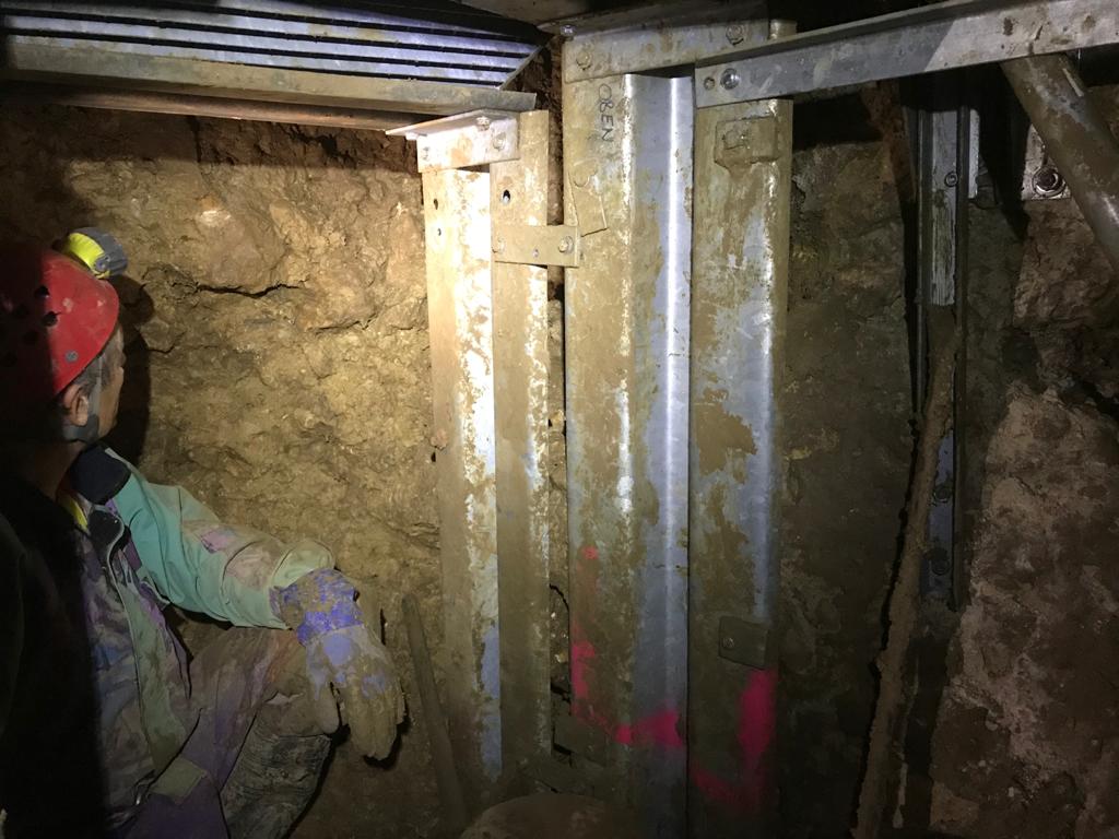 Der Stollen wird mit ausgedienten Straßenleitplanken abgesichert.